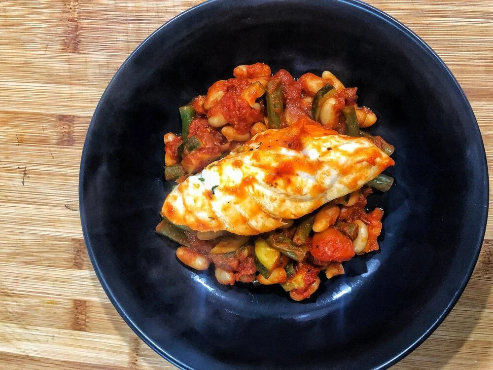I have put this recipe together to solve both of these issues. Using a thick tomato and bean sauce is not only more forgiving on the cooking time, making it harder to overcook or dry out, it also serves as a filter to reduce the fishy smell that can come when pan frying or baking fish. As a bonus, this recipes uses one pan for all steps, leaving only one thing to clean at the end!